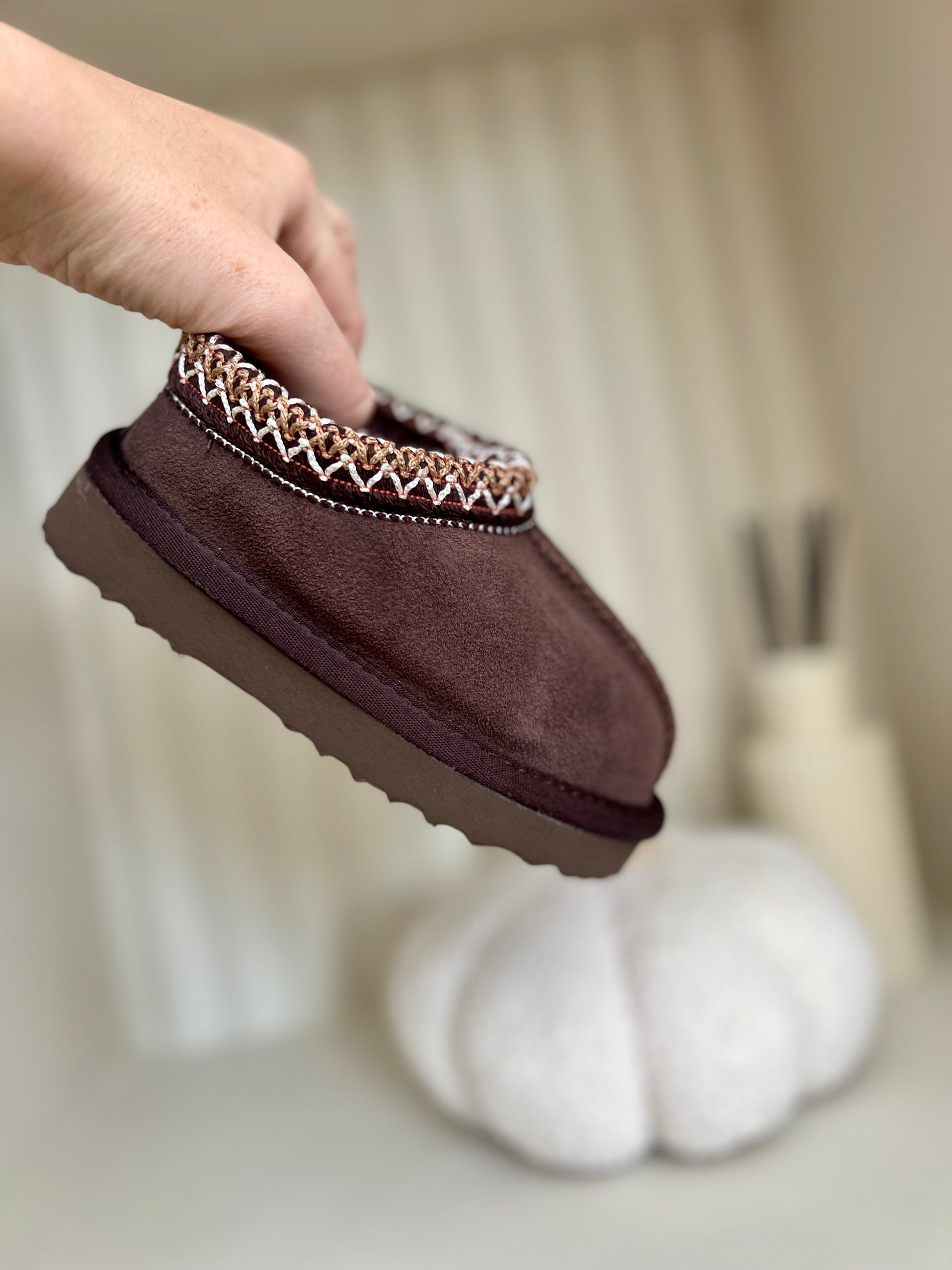 Wrap your child’s toes in warmth with these chocolate brown fur-lined slippers. Soft suede-style fabric, plush lining, and a snug cuff keep every step cozy — perfect for chilly mornings and lazy days.
